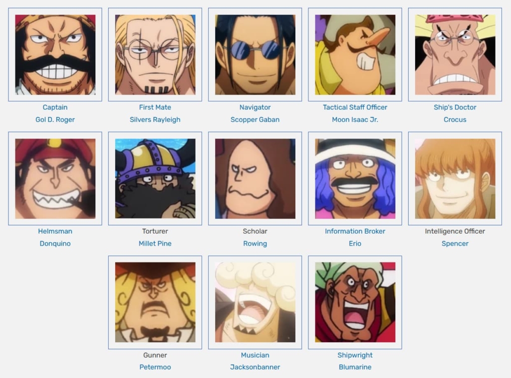 O: Ehhh. Chà, vì Băng hải tặc Roger đã được giới thiệu trong SBS Tập 96 rồi, nên tôi sẽ chỉ liệt kê các cán bộ chủ chốt thôi nhé.