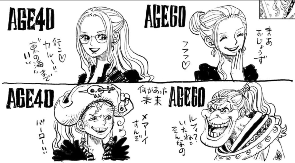 O: Yay! Sanada sẽ không xuất hiện nữa! Tôi sẽ vẽ Vivi như một lời cảm ơn!. (Oda vẽ Vivi ở hai dòng thời gian: Tương lai tốt đẹp (vẫn xinh đẹp, quý phái) và Tương lai tồi tệ).