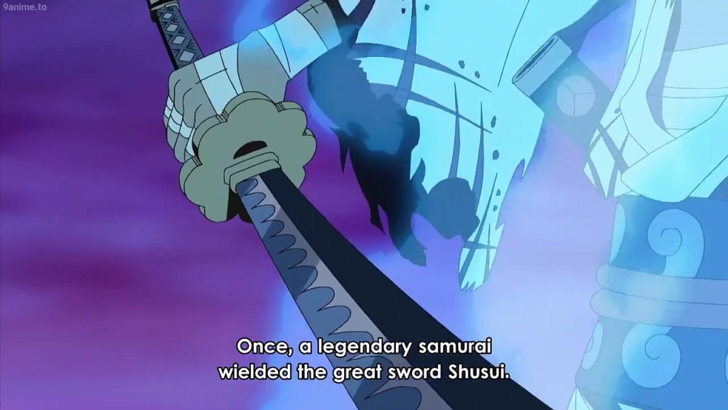 Shusui không được mua, cũng không được tặng theo cách thông thường. Nó là chiến lợi phẩm sau trận đấu tay đôi rực lửa giữa Zoro và xác ướp (Zombie) của Ryuma tại Thriller Bark. Sau khi bị đánh bại, Ryuma đã thừa nhận tinh thần kiếm sĩ của Zoro và trao lại thanh kiếm này với lời nhắn: “Nếu là trong tay ngươi, thanh kiếm này chắc chắn sẽ hài lòng”. Đây là khoảnh khắc mang tính biểu tượng, khi “Thần Kiếm” đời trước trao lại di sản cho kẻ sẽ trở thành “Vua Địa Ngục” tương lai.