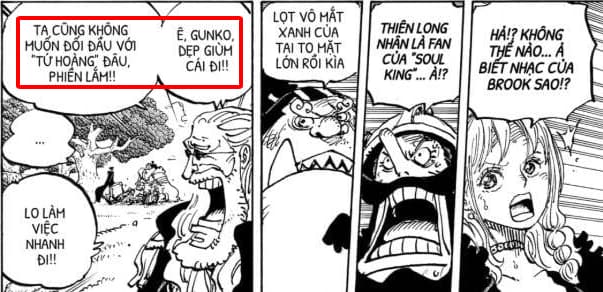 Bạn thấy gì không? Tới cả Thánh hiệp sĩ, cánh tay trái của Imu cũng tỏ ra ngán ngẫm khi nhắc tới tứ hoàng, không muốn đụng chuyện. Và điều này là dành cho tất cả Tứ hoàng hay với riêng mỗi Luffy Mũ Rơm đây?