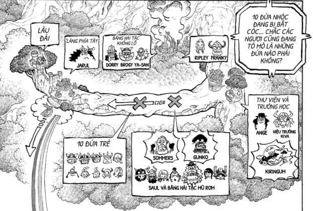 Chúng ta đã thấy một bản đồ vị trí từng nhóm người cụ thể ở Dương Giới. Có thể thấy tụi nhóc đã đi được ½ quản đường, còn nhóm Nami đang bị bắt thì cũng ở gần đó bên cạnh Sommers, Gunko, còn ở phía bến thuyền thì có trưởng lão Jarul.
