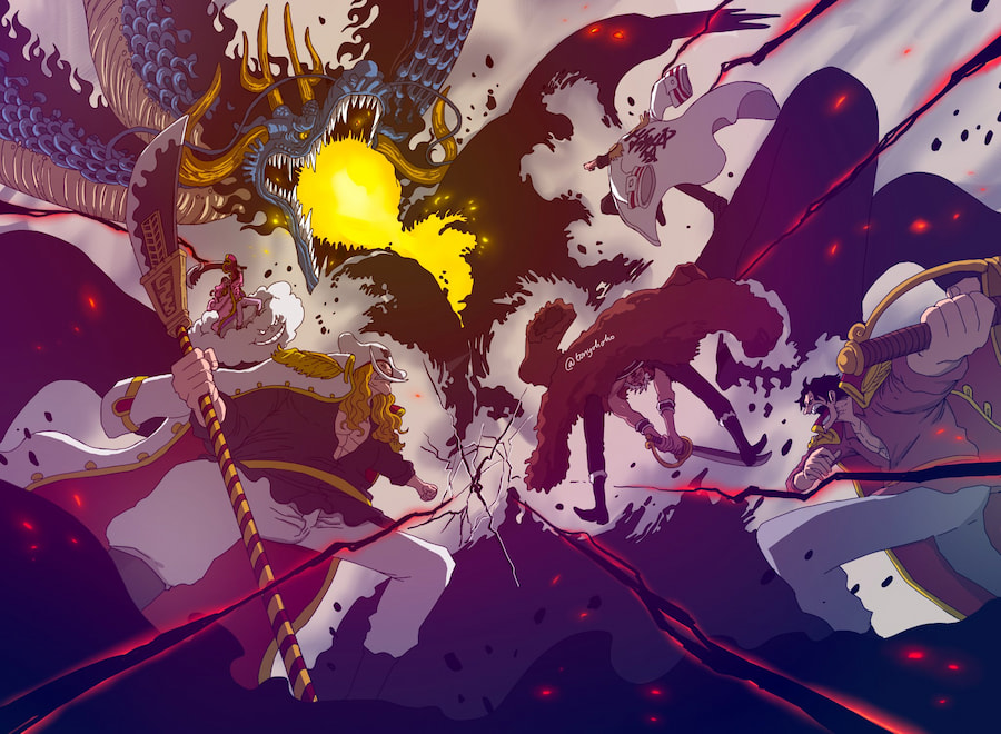 Garp với Cú đấm trực diện / Galaxy Impact – Roger với Thần tị – Rocks với Lời nguyền vực thẳm – Râu Trắng với Thiên không phá – Big Mom với Uy Quốc và cuối cùng là Kaido với LONG! Chính là đòn Nhiệt tức, nhưng vì vội quá chưa nghĩ ra cái tên đó nên cứ gọi đại là Rồng.