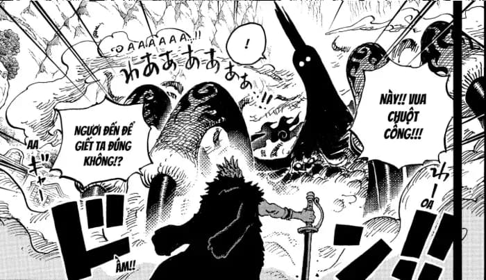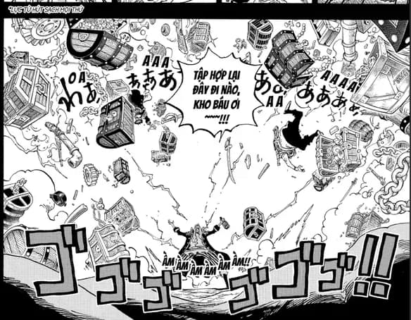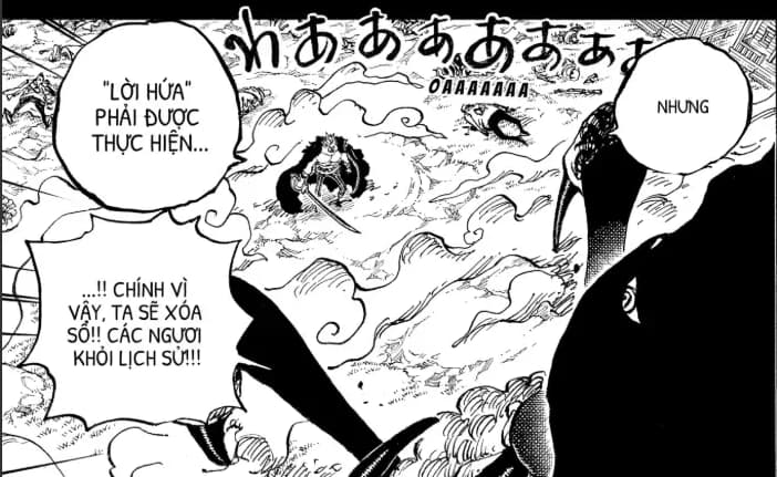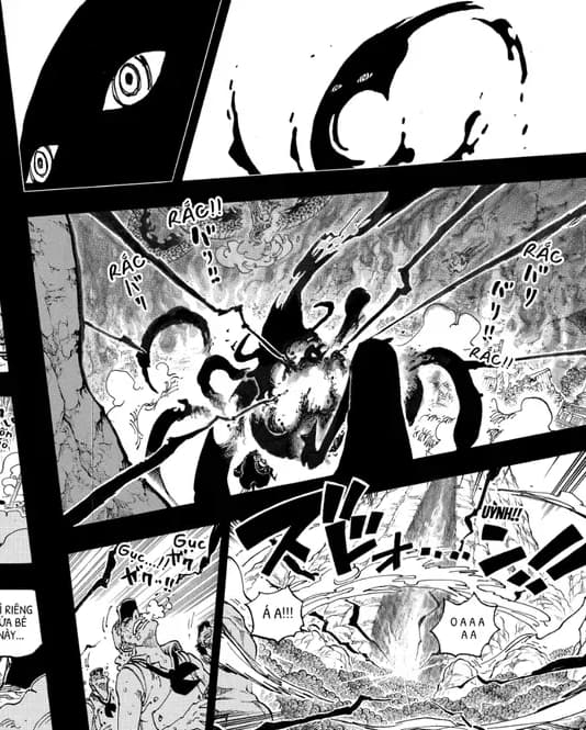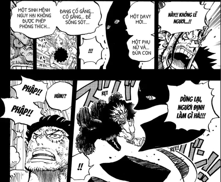Trong phần tiếp theo của Chapter này chúng ta sẽ đến với những hình ảnh điên rồ, mà có lẽ phải sẽ rất lâu nữa khi cuộc chiến giữa Luffy với Imu bắt đầu thì chúng ta mới có cơ hội được lấy lại, cũng như để chúng ta thấy Kaido máu chiến thế nào, đúng kiểu sinh ra để đánh nhau. Đó là một cảnh tượng điên rồ, nhưng đã thật sự xảy ra, 6vs1. Sáu kẻ mạnh top đầu Đại hải trình và cũng là 6 con người đại diện cho hiện tại và tương lai của biển cả này đã tung ra những đòn tấn công uy lực nhất, mạnh nhất vào Imu.