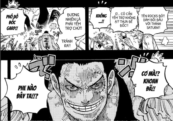 Lúc này những hải quân dưới trướng Garp nhìn cảnh Rocks đối đầu thánh Saturn mà run sợ, hỏi Garp là có nên trợ giúp không, và Garp đáp lại: Đương nhiên là phải yểm trợ chứ, nói xong Garp hùng dũng bước tới chỗ cả 2.