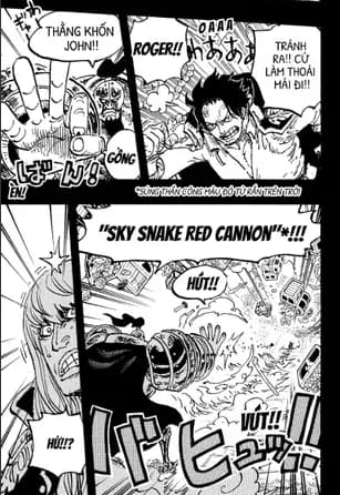 Từ đây thì chúng ta được thấy nội bộ băng Rocks đâm chém lẫn nhau, bất kể bạn thù là như thế nào, khi Ganzui cảm thấy gai mắt với hành động của captain John nên liền móc gỉ mũi tấn công, “Súng thần công màu đỏ từ rắn trên trời” – Tên chiêu thức nghe thì dài dòng như thực tế cái mà Ganzui bắn ra là cục gỉ mũi, hệt như Mr5 tấn công băng Mũ Rơm sau này.